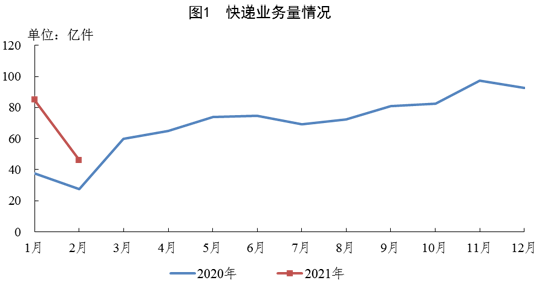 2月份,全國快遞服務(wù)企業(yè)業(yè)務(wù)量完成46.2億件,同比增長67.0%;業(yè)務(wù)收入完成515.7億元,同比增長41.5%。