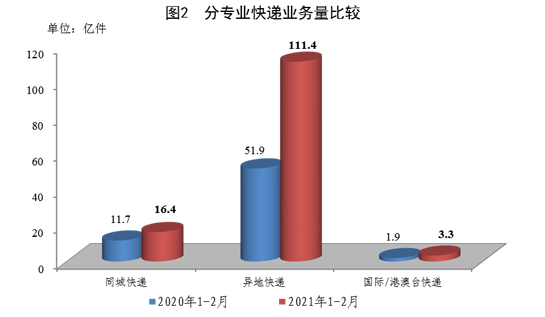 1-2月,全國快遞服務(wù)企業(yè)業(yè)務(wù)量累計完成131.1億件,同比增長100.3%;業(yè)務(wù)收入累計完成1383.3億元,同比增長59.9%。其中,同城業(yè)務(wù)量累計完成16.4億件,同比增長40.3%;異地業(yè)務(wù)量累計完成111.4億件,同比增長114.7%;國際/港澳臺業(yè)務(wù)量累計完成3.3億件,同比增長75.7%。