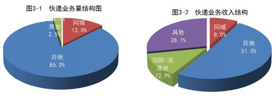 1-2月,同城、異地、國際/港澳臺快遞業(yè)務(wù)量分別占全部快遞業(yè)務(wù)量的12.5%、85%和2.5%;業(yè)務(wù)收入分別占全部快遞收入的8%、51%和12.9%。與去年同期相比,同城快遞業(yè)務(wù)量的比重下降5.4個百分點,異地快遞業(yè)務(wù)量的比重上升5.8個百分點,國際/港澳臺業(yè)務(wù)量的比重下降0.4個百分點。