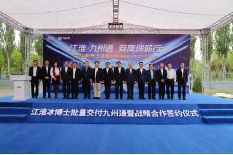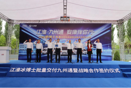 4月21日,江淮·九州通 安康伴你行——江淮冰博士批量交付九州通暨戰略合作簽約儀式在北京九州通醫藥集團物流園盛大舉行。江汽集團控股公司黨委書記、董事長項興初、九州通醫藥集團副董事長劉兆年、九州通醫藥物流公司總經理張青松、中國物流與采購聯合會副會長兼秘書長崔忠付及相關合作單位代表參加儀式。