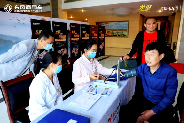 ▲東風商用車幸福卡車關愛計劃聘請的美連大健康醫(yī)護人員在活動現(xiàn)場給卡友做體檢