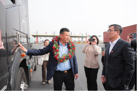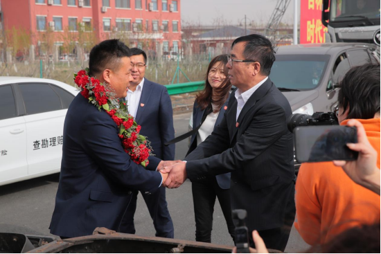 陽光下,黝黑的車身彰顯著成熟與穩(wěn)重,不負(fù)使命,光榮完成這次意義非凡的任務(wù);金色的“鷹標(biāo)”熠熠生輝,閃耀著榮耀與自豪。一汽解放總經(jīng)理助理、銷售公司總經(jīng)理、黨委書記王志才迎上與耿開學(xué)握手,一汽解放汽車銷售有限公司客戶開發(fā)維護(hù)部部長王睿獻(xiàn)上花環(huán)。
