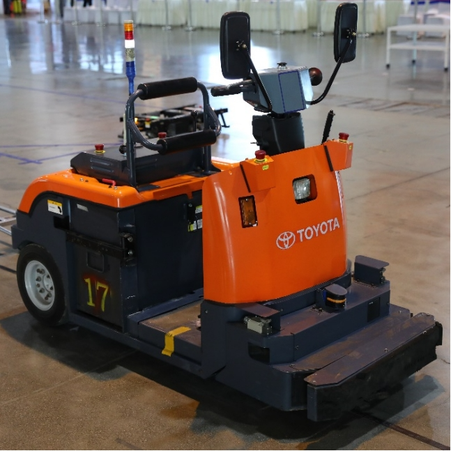 TOYOTA 4CBTYR電動遙控牽引車,可在人工駕駛和遙控駕駛間進行切換,可應用于點對點配給以及多點混載配給,現場駕駛人員演示了人工駕駛和遙控器操控兩種模式的切換。