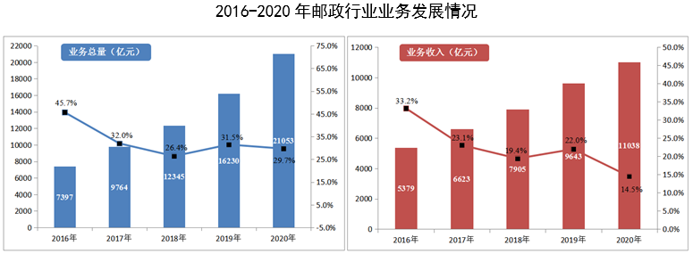 全年郵政行業業務總量完成21053.2億元,同比增長29.7%。全年郵政行業業務收入(不包括郵政儲蓄銀行直接營業收入)完成11037.8億元,同比增長14.5%。
