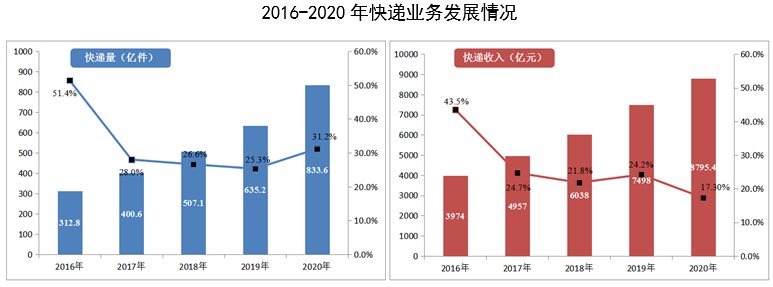 2020年郵政寄遞服務業務量完成255.4億件,同比增長3.3%;郵政寄遞服務業務收入完成406.3億元,同比下降5.2%。