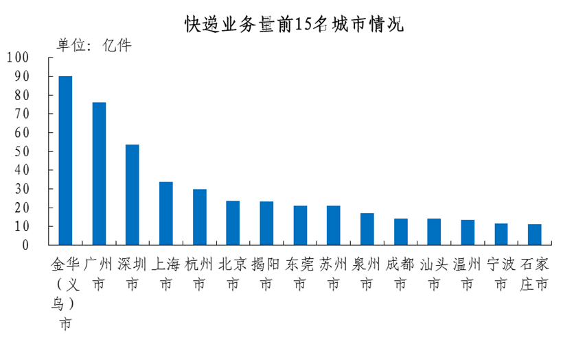 快遞業務量排名前十五位的城市依次是金華(義烏)、廣州、深圳、上海、杭州、北京、揭陽、東莞、蘇州、泉州、成都、汕頭、溫州、寧波和石家莊,其快遞業務量合計占全部快遞業務量的比重達到54.6%。