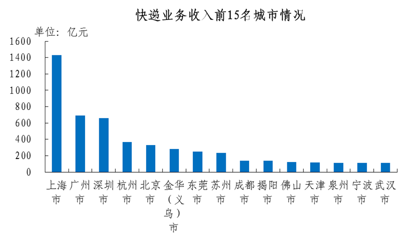 快遞業務收入排名前十五位的城市依次是上海、廣州、深圳、杭州、北京、金華(義烏)、東莞、蘇州、成都、揭陽、佛山、天津、泉州、寧波、武漢,其快遞業務收入合計占全部快遞業務收入的比重達到58%。
