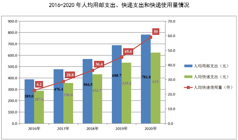 全行業平均每一營業網點服務面積為27.5平方公里;平均每一營業網點服務人口為0.4萬人。郵政城區每日平均投遞2次,農村每周平均投遞5次。全國年人均函件量為1件,每百人訂有報刊量為7.9份,年人均快遞使用量為59件。年人均用郵支出781.8元,年人均快遞支出623元。
