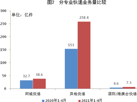 1-4月,全國快遞服務企業業務量累計完成304.3億件,同比增長59.9%;業務收入累計完成3061.6億元,同比增長35.8%。其中,同城業務量累計完成38.6億件,同比增長18.3%;異地業務量累計完成258.4億件,同比增長68.9%;國際/港澳臺業務量累計完成7.3億件,同比增長57%。