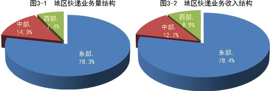 1-4月,東、中、西部地區快遞業務量比重分別為78.3%、14.3%和7.4%,業務收入比重分別為78.4%、12.7%和8.9%。與去年同期相比,東部地區快遞業務量比重下降1.5個百分點,快遞業務收入比重下降1.4個百分點;中部地區快遞業務量比重上升1.9個百分點,快遞業務收入比重上升1.4個百分點;西部地區快遞業務量比重下降0.4個百分點,快遞業務收入比重基本持平。