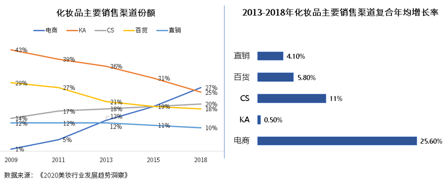 《2020美妝行業發展趨勢洞察》數據顯示,2020年我國美妝行業市場規模達4000億元,已經成為全球第二大美妝市場。越來越多的美妝品牌企業加速線上布局,小紅書、抖音、快手等社交電商渠道迅速崛起,美妝線上渠道銷售占比不斷增加。2013-2018年,化妝品電商渠道復合年均增長率達25.60%,并躍居成為化妝品第一大銷售渠道;與此同時,CS、百貨、直銷、KA等傳統美妝銷售渠道的銷售額也在穩步提升。