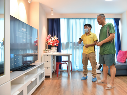 (蘇寧配送員正在幫顧客調(diào)試電視)