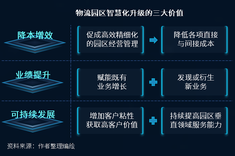 在物流園區經營方式、盈利方式與競爭方式變革之際,通過云計算、物聯網、大數據、人工智能等技術與物流園區融合,實現物流園區智慧化變革升級是順應時代發展機遇的最優解,并成為了物流園區行業的普遍發展趨勢。物流園區智慧化升級能夠為園區帶來明顯的三大價值,助推物流園區主動融入行業變革之際,提升園區市場競爭力: