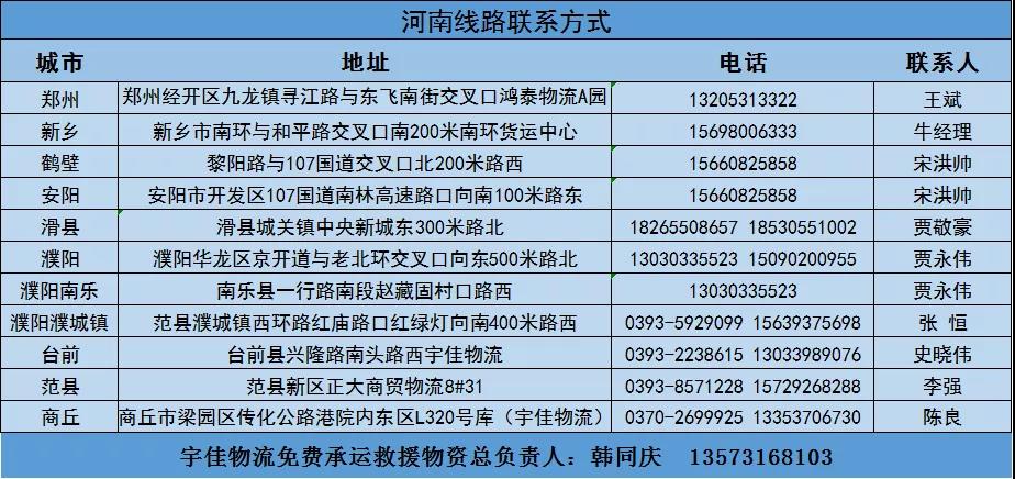 即日起,永昌物流將免費承運發往河南的防汛救災捐贈物資!免費承運線路包括鄭州、濮陽、洛陽、商丘、漯河、駐馬店、新鄉、南陽、平頂山等地。以下是聯系方式及地址,請有需求的企業或個人隨時聯系我們!