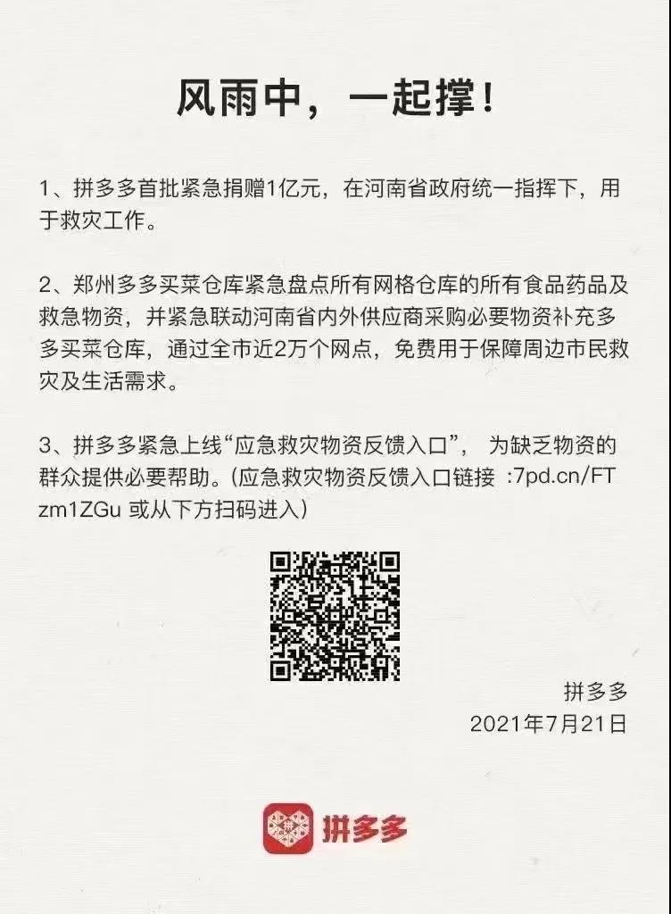 拼多多宣布首期捐款1億元,馳援河南抗災。21日起,鄭州多多買菜加急盤點本地所有網格站點的食品、藥品等救急物資,免費用于保障周邊市民救災及生活需求。目前,買菜工作人員正緊急聯動河南省內外的供應商,采購救災及生活物資補充供給,并將通過全市近兩萬個門店網點,免費提供給受災群眾。