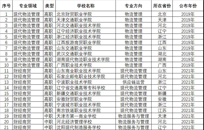 2019年至2021年,教育部分兩個批次分布公布了120個和240個創新團隊,物流類專業共有21個團隊入選(其中18個高職院校、3個中職院校),包括現代物流管理(高職)、供應鏈運營(高職)、物流服務與管理(中職)三個專業,涵蓋13個省市自治區。