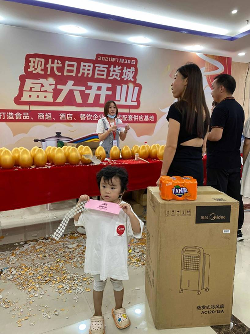 7月30日至8月1日,現代日用百貨城推出了為期三天的開業酬賓大抽獎活動,當天采購滿800元就可以得到一次砸金蛋機會,獎品包括空調、空調扇、飲料等各種夏季用品。