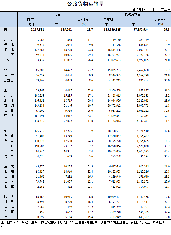 2021年7月公路貨物運輸量
