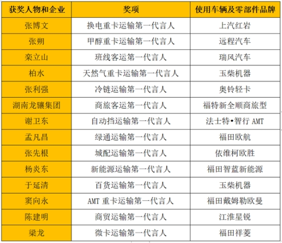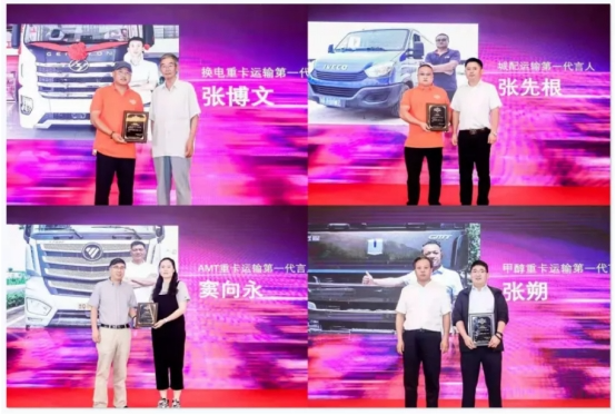 這14位“第一代言人”分別是:“換電重卡運輸第一代言人”張博文、“甲醇重卡運輸第一代言人”張朔、“班線客運第一代言人”欒立山、“天然氣重卡運輸第一代言人”柏水、“冷鏈運輸第一代言人”張利強、“商旅客運第一代言人”湖南龍驤集團、“自動擋運輸第一代言人”謝衛東、“綠通運輸第一代言人”孟凡昌、“城配運輸第一代言人”張先根、“新能源運輸第一代言人”楊炎東、“百貨運輸第一代言人”于延清、“AMT重卡運輸第一代言人”竇向永、“商貿運輸第一代言人”陳建明,以及“微卡運輸第一代言人”梁龍。