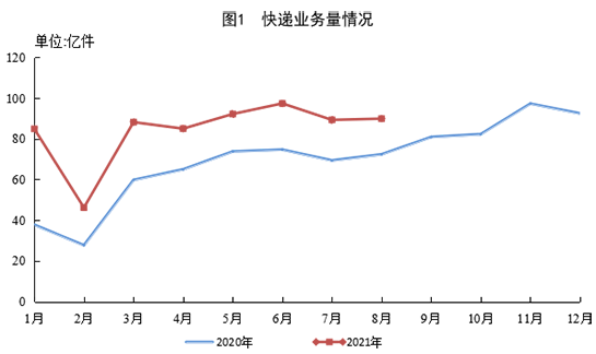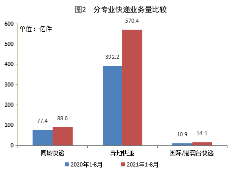 1-8月,全國(guó)快遞服務(wù)企業(yè)業(yè)務(wù)量累計(jì)完成673.2億件,同比增長(zhǎng)40.1%;業(yè)務(wù)收入累計(jì)完成6509.4億元,同比增長(zhǎng)23.4%。其中,同城業(yè)務(wù)量累計(jì)完成88.6億件,同比增長(zhǎng)14.5%;異地業(yè)務(wù)量累計(jì)完成570.4億件,同比增長(zhǎng)45.4%;國(guó)際/港澳臺(tái)業(yè)務(wù)量累計(jì)完成14.1億件,同比增長(zhǎng)29.4%。