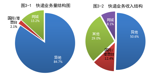 1-8月,同城、異地、國(guó)際/港澳臺(tái)快遞業(yè)務(wù)量分別占全部快遞業(yè)務(wù)量的13.2%、84.7%和2.1%;業(yè)務(wù)收入分別占全部快遞收入的8.1%、50.6%和12.4%。與去年同期相比,同城快遞業(yè)務(wù)量的比重下降2.9個(gè)百分點(diǎn),異地快遞業(yè)務(wù)量的比重上升3.1個(gè)百分點(diǎn),國(guó)際/港澳臺(tái)業(yè)務(wù)量的比重下降0.2個(gè)百分點(diǎn)。