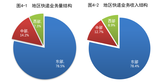 1-8月,東、中、西部地區(qū)快遞業(yè)務(wù)量比重分別為78.5%、14.2%和7.3%,業(yè)務(wù)收入比重分別為78.4%、12.7%和8.9%。與去年同期相比,東部地區(qū)快遞業(yè)務(wù)量比重下降1.4個(gè)百分點(diǎn),快遞業(yè)務(wù)收入比重下降1.5個(gè)百分點(diǎn);中部地區(qū)快遞業(yè)務(wù)量比重上升1.4個(gè)百分點(diǎn),快遞業(yè)務(wù)收入比重上升1.1個(gè)百分點(diǎn);西部地區(qū)快遞業(yè)務(wù)量比重基本持平,快遞業(yè)務(wù)收入比重上升0.4個(gè)百分點(diǎn)。