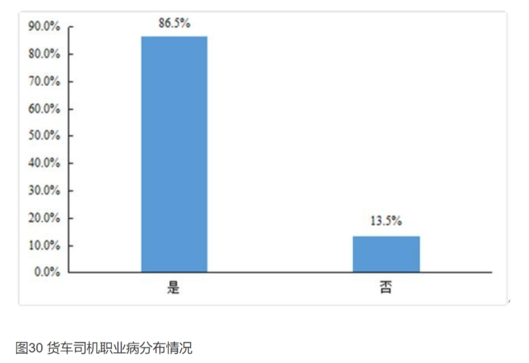圖:調查顯示,86.5%的貨車司機因為開車患有胃病、頸椎病、高血壓等職業病,貨車司機健康問題值得引起關注,僅有13.5%的貨車司機沒有出現上述健康問題。