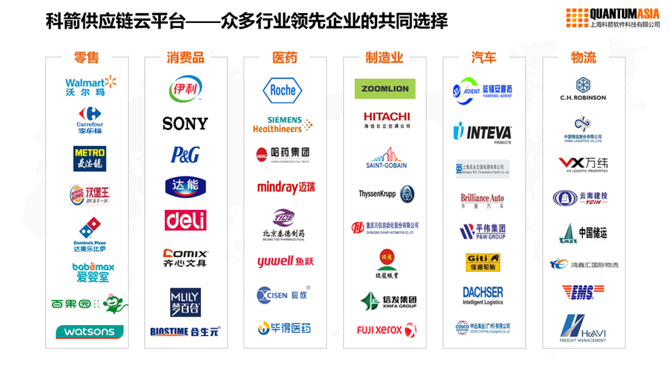 科箭供應(yīng)鏈管理云平臺(tái)-Power SCM Cloud推出以來,已經(jīng)在家樂福、麥德龍、沃爾瑪、達(dá)能飲料、哈藥集團(tuán)、伊利集團(tuán)、延鋒安道拓、中聯(lián)重科、富士施樂、玖龍紙業(yè)及C.H.Robinson、德莎物流、中儲(chǔ)物流等眾多行業(yè)領(lǐng)先企業(yè)成功應(yīng)用。