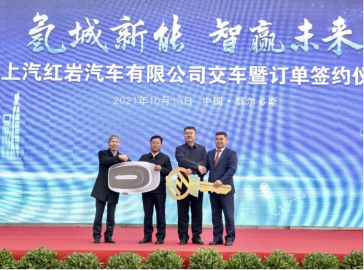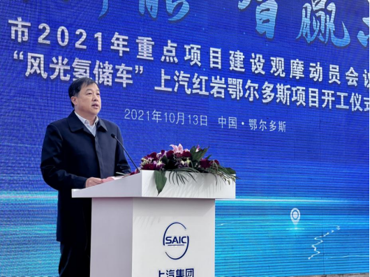 2021年10月13日,上汽紅巖汽車有限公司內蒙古分公司與內蒙古捷氫科技有限公司揭牌暨奠基儀式在內蒙古鄂爾多斯市隆重舉行,標志著全球首個萬輛級氫能重卡產業鏈項目正式啟動。內蒙古鄂爾多斯市委書記李理,市委副書記、代市長杜匯良等市領導以及伊金霍洛旗等各旗區領導,上汽集團副總裁藍青松,上汽集團副總裁、總工程師祖似杰等領導以及上汽紅巖、捷氫科技相關領導,及客戶、經銷商、媒體代表等200余人出席活動,共同見證助力打造“北疆綠氫城”的歷史時刻。