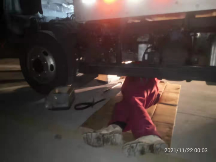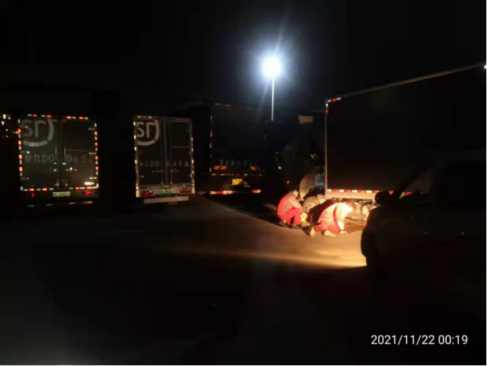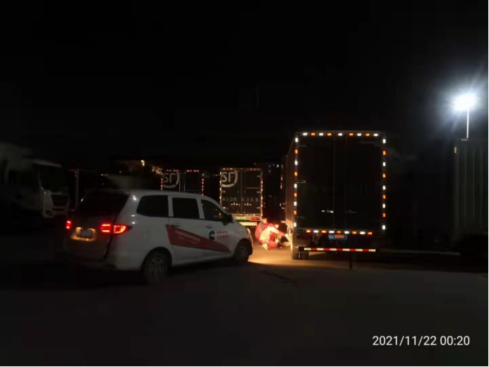 但是他們只考慮到錯峰保養不耽誤用戶用車,卻沒有想到降溫后的鄭州,夜間露天室外工作是又黑又冷。保養工作剛準備進行,正裕服務站的服務人員就遇到了問題,此時已經是深夜,室外停車場燈光微弱,而且快遞車輛多數停放于背光處,好在服務人員經驗豐富,打開了工作保障車的大燈,并將高度調低,對準需要保養的車輛。