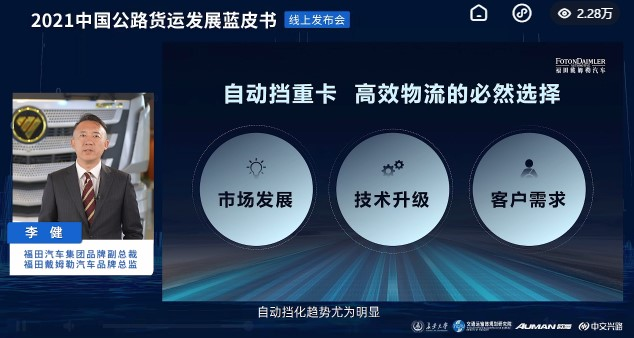 同時,自動擋重卡也將是未來一大發展方向。福田汽車集團品牌副總裁、福田戴姆勒汽車品牌總監李健在直播中提到,從中國乘用車市場的成功經驗和普及經驗來看,目前除了極個別的性能車還是手動擋以外,乘用車的自動擋化已經達到了70%,可以說已經全面實現了自動擋的普及。同時,從全球重卡自動擋的市場發展來看,歐洲以及北美對于成熟的牽引車市場