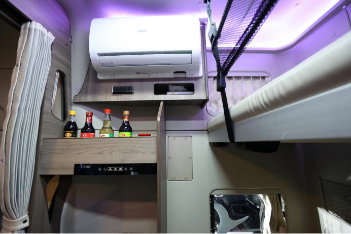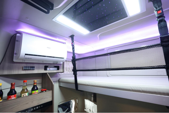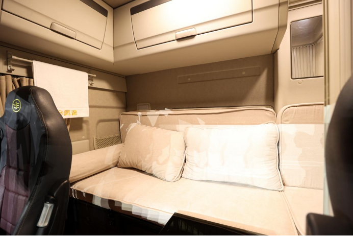 不僅如此,為了讓24小時在車上生活的卡友們能夠真正地感受到像是在家里生活的感覺,鷹途還推出了健康廚房系統,車載冰箱、電磁爐等設備一應俱全,完全能夠滿足司機的日常燒水做飯,空閑時還能做一頓大餐犒勞犒勞自己。鷹途的臥鋪最寬能夠達到1.4米,兩個人躺在上面也絲毫不顯擁擠;此外,車載大屏、娛樂設備等也應有盡有,可以充分滿足年輕人想要躺在床上看電影的生活需求。