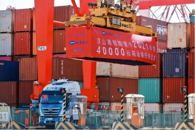 2021年12月23日,在上汽集團賦能下,上汽紅巖、友道智途洋山港智能重卡在上海洋山港正式裝箱啟運第4萬標(biāo)箱,圓滿完成2021年度4萬標(biāo)箱運輸任務(wù),為建設(shè)世界一流港口提供“硬核”支撐,也為世界級樞紐港口建設(shè)提供“中國方案”,充分展現(xiàn)出“中國力量”。