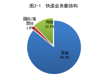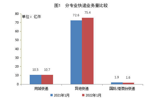 1月份,同城、異地、國際/港澳臺快遞業(yè)務(wù)量分別占全部快遞業(yè)務(wù)量的12.2%、86.0%和1.8%;業(yè)務(wù)收入分別占全部快遞收入的6.7%、49.7%和10.4%。與去年同期相比,同城快遞業(yè)務(wù)量的比重下降0.2個百分點,異地快遞業(yè)務(wù)量的比重上升0.6個百分點,國際/港澳臺業(yè)務(wù)量的比重下降0.4個百分點。