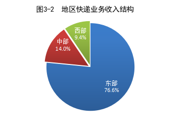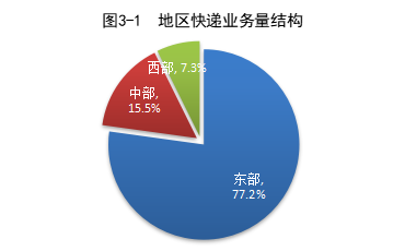 1月份,東、中、西部地區(qū)快遞業(yè)務(wù)量比重分別為77.2%、15.5%和7.3%,業(yè)務(wù)收入比重分別為76.6%、14.0%和9.4%。與去年同期相比,東部地區(qū)快遞業(yè)務(wù)量比重基本持平,快遞業(yè)務(wù)收入比重下降0.9個百分點;中部地區(qū)快遞業(yè)務(wù)量比重上升0.4個百分點,快遞業(yè)務(wù)收入比重上升0.7個百分點;西部地區(qū)快遞業(yè)務(wù)量比重下降0.4個百分點,快遞業(yè)務(wù)收入比重上升0.2個百分點。