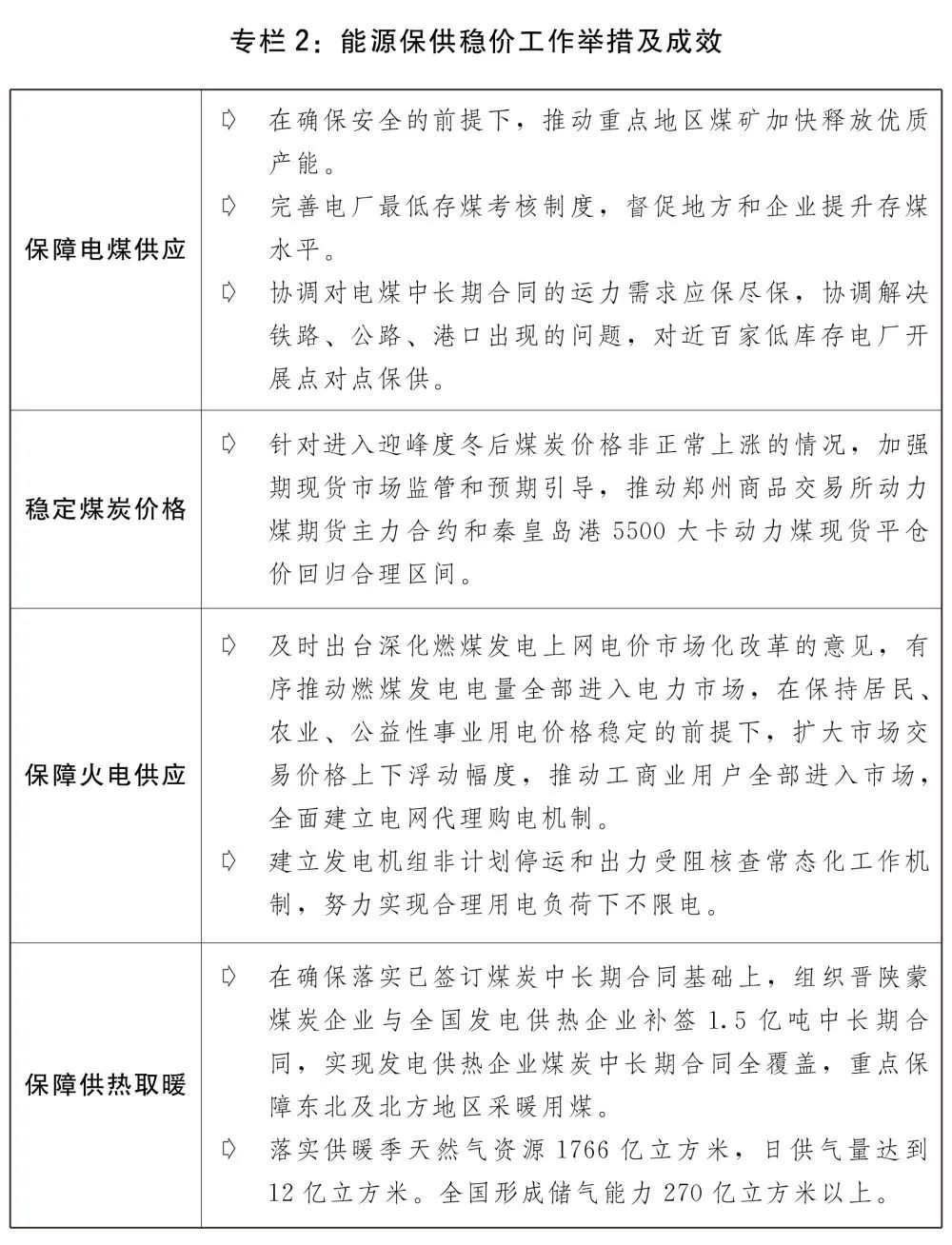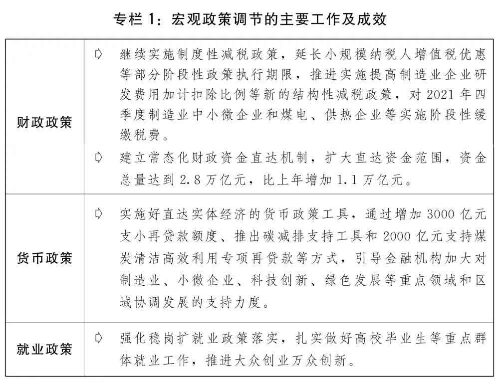 二是保持宏觀政策連續性針對性。宏觀政策適應跨周期調節需要,保持對經濟恢復必要支持力度,同時考慮為今年應對困難挑戰預留政策空間。積極的財政政策提質增效、更可持續。保持必要的財政支出規模,地方政府專項債券發行使用管理進一步優化,建立常態化財政資金直達機制,將2.8萬億元中央財政資金納入直達范圍,及時為基層保基本民生、保工資、保運轉提供財力支持。全年新增減稅降費為市場主體減負超過1萬億元。對制造業中小微企業、煤電和供熱企業實施階段性緩繳稅費。貨幣政策靈活精準、合理適度,靈活運用降準、再貸款、再貼現等多種政策工具,兩次全面降準,流動性保持合理充裕,廣義貨幣供應量(M2)余額和社會融資規模存量分別增長9%和10.3%。加大對實體經濟、重點領域和薄弱環節的支持力度,企業綜合融資成本穩中有降,全年新增人民幣貸款19.95萬億元,比上年多增3150億元,大型商業銀行普惠小微企業貸款增幅超過40%,企業貸款平均利率為4.61%,比上年下降0.1個百分點。強化穩崗擴就業政策落實,扎實做好高校畢業生等重點群體就業工作,推進大眾創業萬眾創新。三是糧食能源等重要資源保供穩價工作有力有效。針對玉米、煤炭、鐵礦石、銅鋁鋅等大宗商品價格異常波動,及時采取供需雙向調節、期現貨市場聯動監管、預期引導等措施,打出保供穩價的政策組合拳,有力促進了價格回歸合理區間。加強糧食市場調控,合理安排進口和政策性糧食庫存銷售,有效保障糧食市場穩定供應。加強期貨市場監管和新棉收購引導,適時增加中央儲備棉投放,促進棉花市場平穩有序運行。著力解決煤炭電力供應緊張問題,推動煤炭增產增供和價格回歸合理水平,支持發電供熱企業紓困解難,提升煤電支撐保障能力,改革完善煤電價格市場化形成機制,擴大市場交易價格上下浮動幅度,加強煤炭、液化天然氣(LNG)等能源物資產運需銜接和運輸保障,確保民生和公共用能需求,推進全社會節約用電。發揮跨部門協調工作機制作用,做好化肥市場保供穩價工作。制定實施原材料價格上漲應對方案以及分品種保供穩價工作方案。發揮國家儲備市場調節作用,分批投放原油成品油和銅鋁鋅等國家儲備。