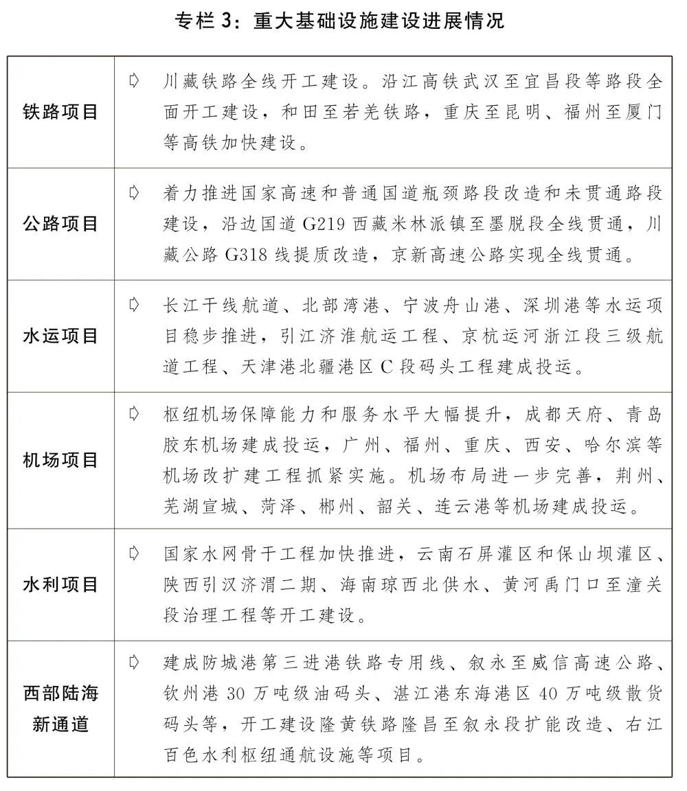 三是基礎設施發展質量效益不斷提升。川藏鐵路、西部陸海新通道、沿江高鐵等重大項目建設進展順利,烏東德水電站12臺機組全部建成投產,雅魯藏布江下游水電開發前期工作有序推進。全年鐵路投資完成7489億元,鐵路營運總里程突破15萬公里,其中高鐵運營里程突破4萬公里,“四縱四橫”高鐵網全面建成,“八縱八橫”高鐵網正在加密形成。修訂國家公路網規劃和全國港口與航道布局規劃,公路水路建設穩步推進,建成自動化碼頭10座。革命老區、沿邊抵邊基礎設施建設扎實推進。加快推進新型基礎設施建設,建成全球最大的5G獨立組網網絡。交通低碳、智能發展加快推進。