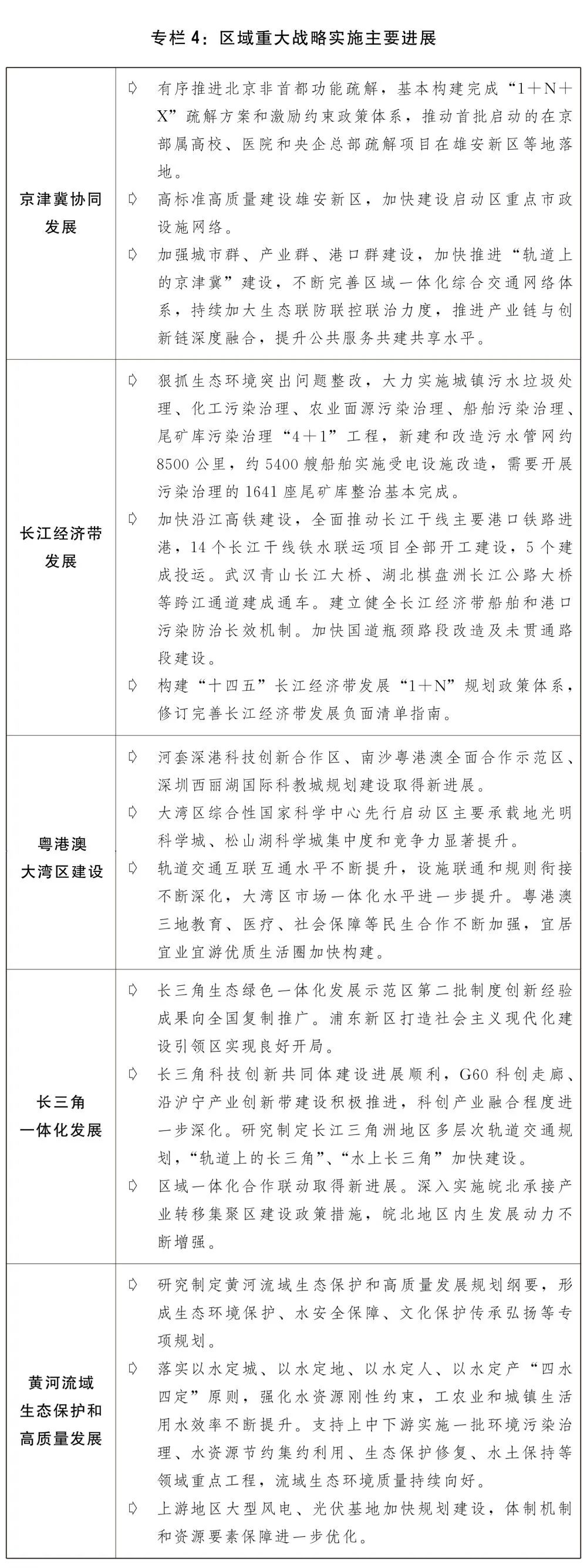 一是鞏固拓展脫貧攻堅成果同鄉村振興有效銜接。確定160個國家鄉村振興重點幫扶縣。加大銜接推進鄉村振興補助資金投入力度,支持欠發達地區培育特色優勢產業。加強對脫貧不穩定戶、邊緣易致貧戶和突發嚴重困難戶的監測幫扶,將240萬人納入低保或特困供養范圍。加大以工代賑和易地扶貧搬遷后續扶持工作力度,開展搬遷安置區就業協作幫扶,基本實現有勞動力的搬遷家庭至少一人就業,脫貧勞動務工規模達3145萬人。推動消費幫扶提檔升級,市場化幫扶比例超過2/3。深化東西部協作和中央單位定點幫扶,開展“萬企興萬村”行動,推動脫貧地區種養業高質量發展。二是現代農業基礎持續夯實。及時有力做好洪澇、臺風、干旱等自然災害應對,啟動512處大中型灌區續建配套與現代化改造。對種糧農民一次性發放200億元補貼,應對農資價格較快上漲等影響。提高稻谷、小麥最低收購價,確保口糧絕對安全。糧食總產量達到13657億斤,實現高位增產,玉米年產量創歷史最高水平,肉蛋奶產量達到1.6億噸,蔬菜、水果等“菜籃子”產品量足價穩。農業生產力布局優化與結構調整加快推進,新建高標準農田1.05億畝。啟動實施國家黑土地保護工程,東北黑土地保護性耕作7200萬畝。開展全國農業種質資源普查,核心種源技術攻關加快推進,種業振興穩步開局。推進棉花、食糖產供儲加銷體系建設。三是鄉村建設有序推進。實施鄉村建設行動和農村人居環境整治提升五年行動。實施農網鞏固提升工程,進一步提升農村用電質量和水平。開展中小河流治理、大中型病險水庫除險加固等水利薄弱環節工程建設,防汛基礎設施短板進一步補齊。加快長江黃河流域農業面源污染治理項目建設,實施畜禽糞污資源化利用整縣推進項目。因地制宜推進農村廁所革命,全國農村衛生廁所普及率超過70%。生活污水和垃圾治理力度加大,生活垃圾進行收運處理的自然村比例穩定保持在90%以上?,F有行政村全面實現村村通寬帶,農村自來水普及率達84%。深入推進農村產業融合發展,新創建一批農業現代化示范區、國家現代農業產業園,第三批國家農村產業融合發展示范園創建工作積極開展。(六)有效推動區域協調發展和新型城鎮化建設,區域經濟布局調整優化。發揮比較優勢、突出區域特色,著力促進城鄉融合發展,深入實施區域重大戰略和區域協調發展戰略,地區經濟運行穩中加固、穩中向好。一是區域重大戰略深入實施。北京非首都功能疏解取得新突破,國務院印發《關于支持北京城市副中心高質量發展的意見》,雄安新區進入大規模建設階段,落實支持天津濱海新區高質量發展的意見,張家口首都水源涵養功能區和生態環境支撐區加快建設。長江經濟帶生態優先、綠色發展深入推進,生態環境突出問題整改和污染治理“4+1”工程穩步推進實施,生態環境系統保護修復成效明顯,長江十年禁漁實現良好開局,水生生物資源逐步恢復,沿江綜合交通運輸體系加快構建,長江保護法正式實施。粵港澳大灣區建設穩步推進,中共中央、國務院印發《橫琴粵澳深度合作區建設總體方案》、《全面深化前海深港現代服務業合作區改革開放方案》,基礎設施和公共服務融合有序開展。長三角一體化發展深入推進,基礎設施互聯互通水平持續提升,一體化發展體制機制不斷優化,中共中央、國務院印發《關于支持浦東新區高水平改革開放 打造社會主義現代化建設引領區的意見》,構建長三角世界級港口群形成一體化治理體系、共建虹橋國際開放樞紐等重大任務有力推進,生態綠色一體化發展示范區建設取得顯著成效?!笆奈濉秉S河流域生態保護和高質量發展實施方案印發,農業、工業、城鎮生活和尾礦庫污染“3+1”綜合治理方案扎實推進,污染防治、生態保護修復、深度節水控水、水土保持等領域重大工程項目穩步實施,在黃河省區完成1.2萬平方公里水土流失治理任務。二是區域協調發展戰略持續推進。執行新修訂的《西部地區鼓勵類產業目錄》,優惠政策覆蓋面進一步擴大,促進400毫米降水線西側區域保護發展。東北地區國資國企改革持續推進,結構調整與布局優化力度加大,遼寧沿海經濟帶高質量發展規劃印發實施。中共中央、國務院印發《關于新時代推動中部地區高質量發展的意見》。支持湖北經濟社會發展一攬子政策任務全部完成,河南等地救災與災后恢復重建工作扎實推進。鼓勵東部地區進一步提升創新能力,福建全方位推動高質量發展,濟南新舊動能轉換起步區加快建設,江蘇沿海地區發展規劃印發實施。有力推進重點領域重點平臺建設,國家級新區和承接產業轉移示范區、臨空經濟示范區等重點項目加快建設。以脫貧地區為重點的欠發達地區、革命老區、邊境地區、生態退化地區、資源型地區和老工業城市等特殊類型地區振興發展支持力度持續加大。加快發展海洋經濟,推進建設海洋強國。三是以人為核心的新型城鎮化深入推進。堅持走中國特色新型城鎮化道路,進一步完善新型城鎮化戰略,常住人口城鎮化率達64.72%。城市落戶限制有序放開放寬,城鎮基本公共服務覆蓋未落戶常住人口工作持續推進,農業轉移人口技能素質持續提升。城市群和都市圈承載能力不斷提高,成渝地區雙城經濟圈建設“1+N”規劃體系加快形成。縣城補短板強弱項工作加快推進,120個縣城建設示范地區帶動