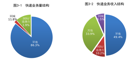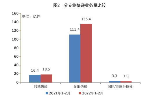 1-2月,同城、異地、國際/港澳臺快遞業務量分別占全部快遞業務量的11.8%、86.3%和1.9%;業務收入分別占全部快遞業務收入的6.5%、49.4%和10.2%。與去年同期相比,同城快遞業務量的比重下降0.7個百分點,異地快遞業務量的比重上升1.3個百分點,國際/港澳臺業務量的比重下降0.6個百分點。