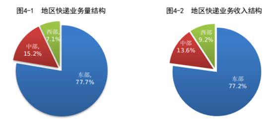 1-2月,東、中、西部地區快遞業務量比重分別為77.7%、15.2%和7.1%,業務收入比重分別為77.2%、13.6%和9.2%。與去年同期相比,東部地區快遞業務量比重上升0.1個百分點,快遞業務收入比重下降0.5個百分點;中部地區快遞業務量比重上升0.6個百分點,快遞業務收入比重上升0.6個百分點;西部地區快遞業務量比重下降0.7個百分點,快遞業務收入比重下降0.1個百分點。