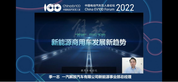 2022年3月25-27日,以“迎接新能源汽車市場化發展新階段“為主題的第八屆中國電動汽車百人會論壇在線上召開,本屆論壇共開設14場會議,聚焦行業熱點,探索發展趨勢。3月27日,一汽解放新能源事業部總經理季一志代表一汽解放在商用車可持續發展論壇發表了主題為《“雙碳”目標下的新能源商用車發展新趨勢》的演講。