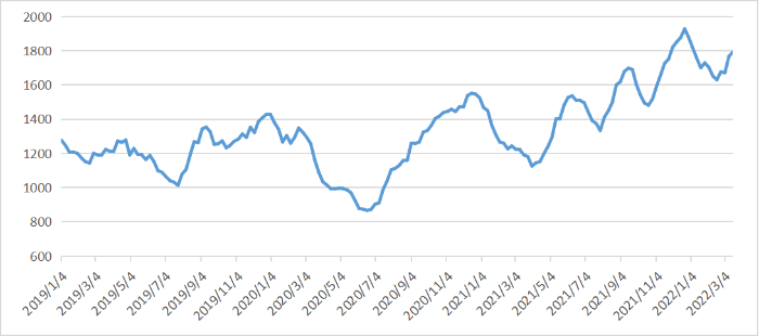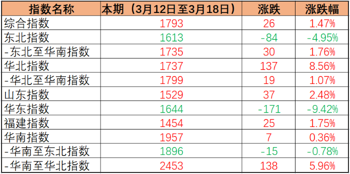 此外,山東指數報收1529點,環比上漲37點,漲幅2.48%;華東指數報收1644點,環比下降171點,降幅9.42%;福建指數報收1454點,環比上漲25點,漲幅1.75%。