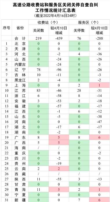 根據(jù)各省(區(qū)、市)上報(bào)數(shù)據(jù)匯總統(tǒng)計(jì),受疫情影響,截至2022年4月16日24時(shí),各省(區(qū)、市)高速公路共關(guān)閉收費(fèi)站219個(gè),占收費(fèi)站總數(shù)的2.03%,比4月10日減少459個(gè),下降了67.7%;共關(guān)停服務(wù)區(qū)76個(gè),占服務(wù)區(qū)總數(shù)的1.15%,比4月10日減少288個(gè),下降了79.12%。除西藏(無高速公路收費(fèi)站和服務(wù)區(qū))外的30個(gè)省(區(qū)、市)中,北京、天津、山西、內(nèi)蒙古、福建、山東、河南、湖南、海南、重慶、四川、貴州、甘肅、寧夏等14個(gè)省份已無關(guān)閉關(guān)停的高速公路收費(fèi)站和服務(wù)區(qū)。