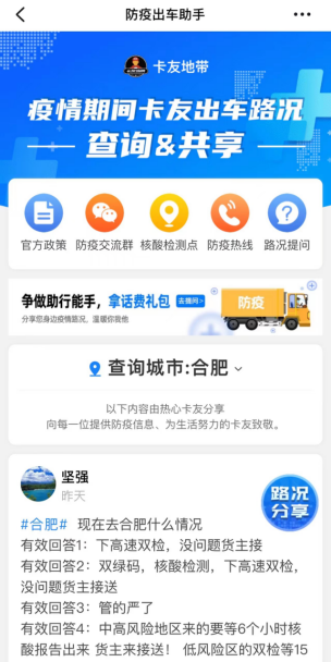 為守護(hù)疫情下受困的卡友,作為全國最大的貨車司機(jī)職業(yè)社區(qū),卡友地帶也在第一時間行動起來。3月,卡友地帶推出針對貨車司機(jī)的新冠疫情隔離保障,免費發(fā)放新冠疫情隔離津貼保險共計8000余份;4月,卡友地帶開發(fā)上線“防疫出車助手”,幫助貨車司機(jī)及時掌握疫情動態(tài)與實時路況;4月14日,卡友地帶攜手合肥高新區(qū)總工會、合肥高新區(qū)道路運輸行業(yè)工會聯(lián)合會,看望慰問滯留合肥的貨車司機(jī),并捐贈愛心物資包1000份……