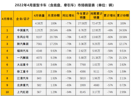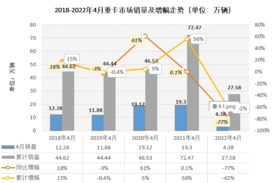 結合近十年重卡市場銷量數據,不難發現,傳統的“金三銀四”變成了淡季,3月銷量跌到8萬輛以下;4月份的重卡市場,則刷新了近幾年的“底線”,月銷量還不足5萬輛。結合疫情以及開年以來國際形勢、油價攀升、存量市場等多重因素影響,大眾投資和消費走低、復工復產受阻等多方因素,造成了人員流動和物資流動的不暢通,抑制了終端用戶的購車需求。