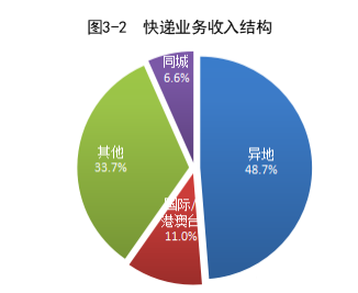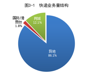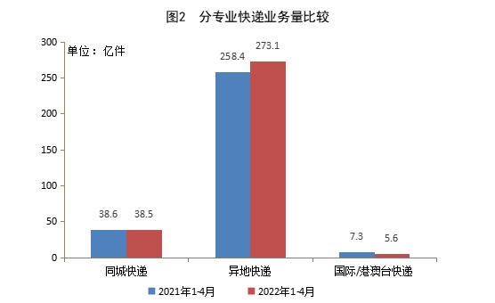 1-4月,同城、異地、國際/港澳臺快遞業務量分別占全部快遞業務量的12.1%、86.1%和1.8%;業務收入分別占全部快遞業務收入的6.6%、48.7%和11%。與去年同期相比,同城快遞業務量的比重下降0.6個百分點,異地快遞業務量的比重上升1.2個百分點,國際/港澳臺業務量的比重下降0.6個百分點。