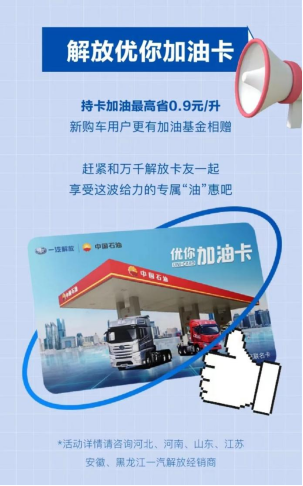 為幫助廣大卡友降低運營燃油成本,提升運營收益,一汽解放與中國石油達成戰略合作,推出解放&中石油聯名加油卡,最高可享直降1元/升加油優惠。