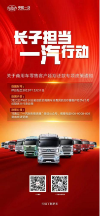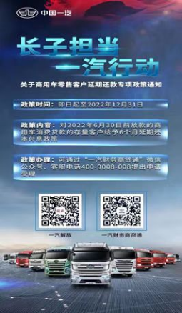政策內(nèi)容:對2022年6月30日前放款的商用車消費貸款的存量客戶,給予6個月延期還本付息政策