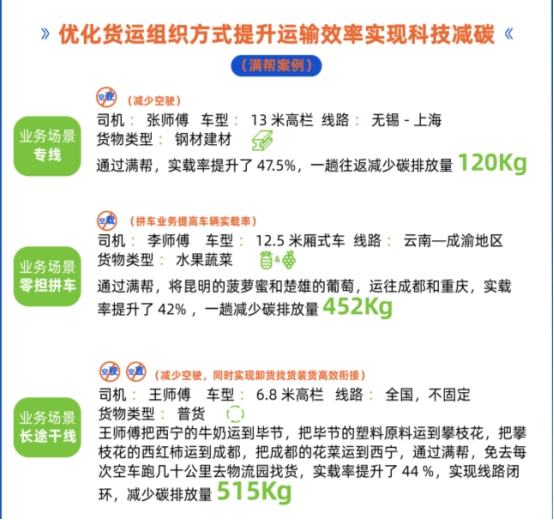 作為互聯網貨運平臺,滿幫憑借覆蓋全國的公路網絡規模和司機集聚優勢,一直在提升運輸效率,降低公路貨運“三空”(空駛、空置、空載)方面發揮著重要作用,毫無疑問也成為了破解公路貨運碳減排難題的“關鍵角色”。