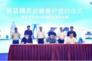 【左:蘇州笠楓&藍(lán)速新能源&智藍(lán)汽車戰(zhàn)略合作簽約現(xiàn)場 右:蘇州笠楓向蘇亥物流交付車鑰匙】
